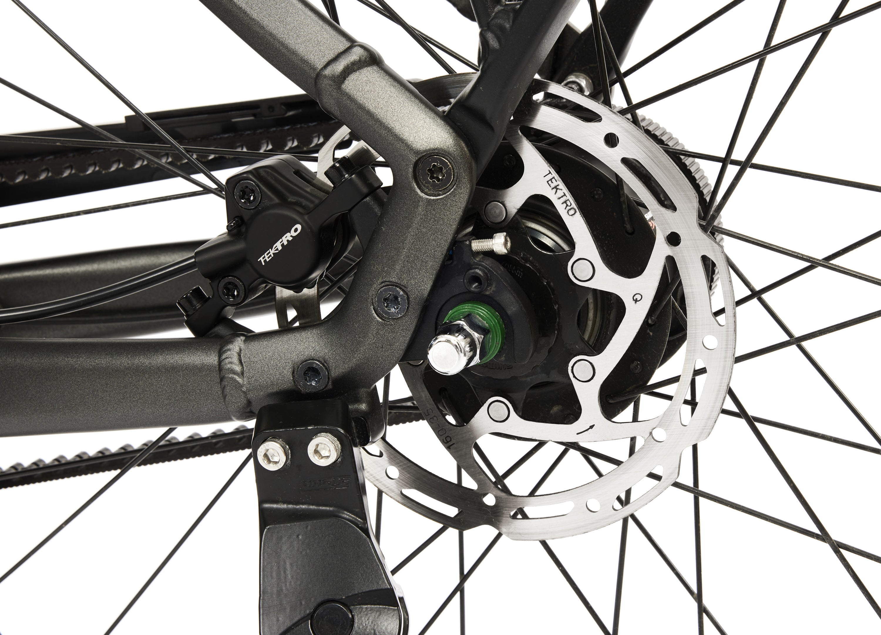 • Hydraulische Tektro-Scheibenbremsen mit elektronischem Bremsunterbrecher vorne und hinten